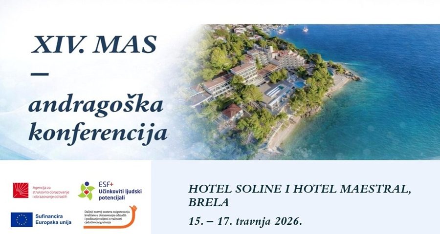 Agencija za strukovno obrazovanje i obrazovanje odraslih organizira XIV. MAS – andragošku konferenciju, koja će se održati od 15. do 17. travnja 2026. u Hotelu Soline, Trg Gospe od Karmela 1, 21322, Brela, i Hotelu Maestral, Filipinska 1, 21322, Brela.